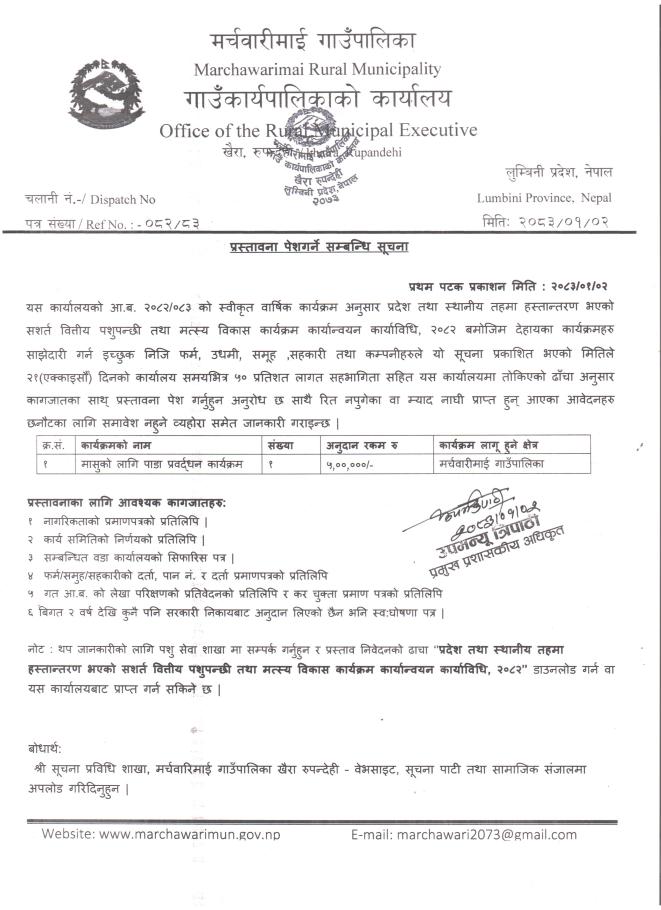 कृषि शाखाकाे तालिम तथा अनुदान कार्यक्रमहरूकाे प्रस्ताव आव्हान सम्बन्धि सूचना