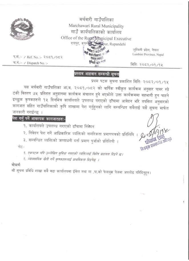 प्रस्तावना तथा दरभाउ पत्र पेश गर्ने सम्बन्धी सूचना