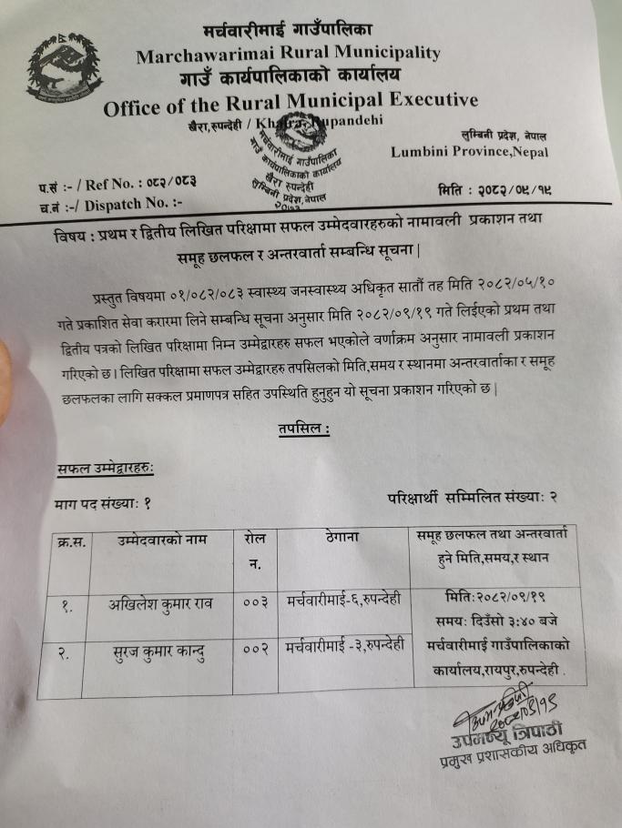 » लिखित परीक्षाको नतिजा प्रकाशन तथा अन्तर्वार्ता र समुह छलफल सम्बन्धी सूचना