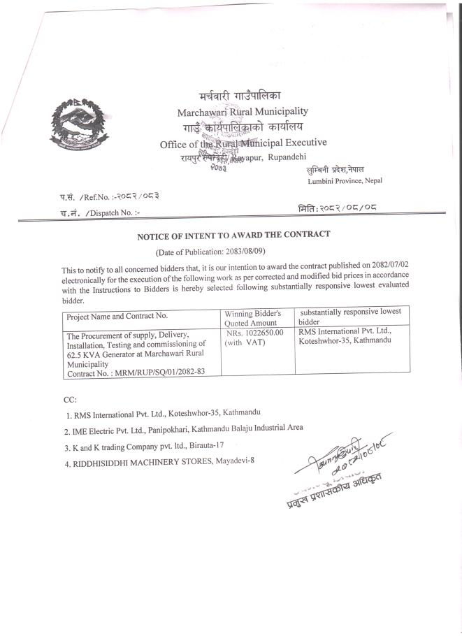 NOTICE OF INTENT TO AWARD THE CONTRACT